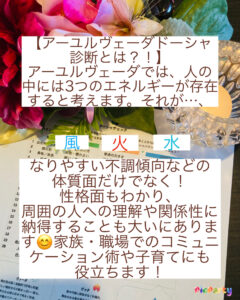 占い感覚で聞けるような?!でも❗️ドクターが治療としてのクライアントさんを診る時に、とてもとても重要な「ドーシャ」と言われる、誰しもの体の中に存在するアーユルヴェーダならではの3つのエネルギー要素についてのお話をしています❣️